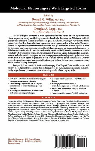 The use of targeted cytotoxins to make highly selective neural lesions for both experimental and clinical purposes has already provided important animal models for diseases such as Alzheimer's, and holds great promise for research and clinical application to pain. In Molecular Neurosurgery With Targeted Toxins, pioneers in the field describe their hands-on experience with the experimental use of these toxins. The authors focus on the highly successful use of the immunotoxins, 192 IgG-saporin and ME20.4-saporin, to lesion the cholinergic basal forebrain in order to model the behavior, anatomy, physiology, and pharmacology of Alzheimer's disease in animals. Also discussed are the uses of anti-DBH-saporin immunotoxin to make remarkably selective lesions of catecholaminergic neurons, hypocretin-saporin that can produce narcoleptic animals, and other saporin conjugates, such as neuropeptide-saporin conjugates for pain research and cholera toxin B chain-saporin to produce a model of central nervous system demyelination. Overview perspectives and, in some cases, more practical details are provided that allow the reader to appreciate exactly what is involved in using these agents.