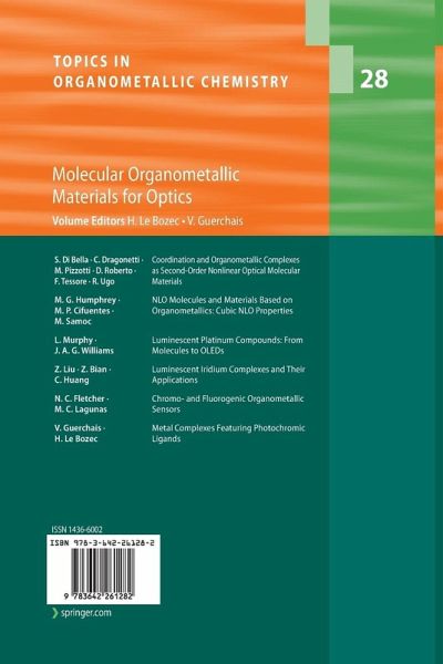 S. Di Bella, C. Dragonetti, M. Pizzotti, D. Roberto, F. Tessore, R. Ugo: Coordination and Organometallic Complexes as Second-Order Nonlinear Optical Molecular Materials.- M. G. Humphrey, M.P. Cifuentes, M. Samoc: NLO Molecules and Materials Based on Organometallics: Cubic NLO Properties.- L. Murphy, J. A. G. Williams: Luminescent Platinum Compounds: From Molecules to OLEDs. - Z. Liu, Z. Bian, C. Huang: Luminescent Iridium Complexes and Their Applications.- N. C. Fletcher, M. C. Lagunas: Chromo- and Fluorogenic Organometallic Sensors.- V. Guerchais, H. Le Bozec: Metal Complexes Featuring Photochromic Ligands.