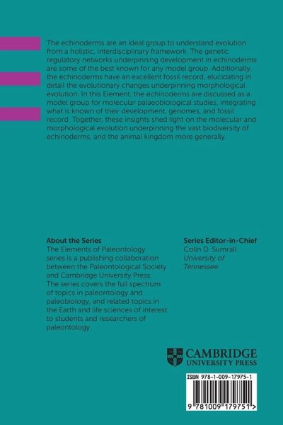In this Element, the echinoderms are discussed as a model group for molecular palaeobiological studies, integrating what is known of their development, genomes, and fossil record.
