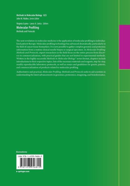 The next revolution in molecular medicine is the application of molecular profiling to individualized patient therapy. Molecular profiling technology has advanced dramatically, particularly in the field of cancer tissue biomarkers. It is now possible to gather complex genomic and proteomic information from a routine clinical needle biopsy or surgical specimen. In Molecular Profiling : Methods and Protocols, expert researchers in the field focus on the entire process from discovery to commercialization, with practical guides that are not limited to experimental methods. Written in the highly successful Methods in Molecular Biology(TM) series format, chapters include introductions to their respective topics, lists of the necessary materials and reagents, step-by-step, readily reproducible laboratory protocols, as well as essays and guidelines for grants, patents, and commercialization of products related to molecular profiling.