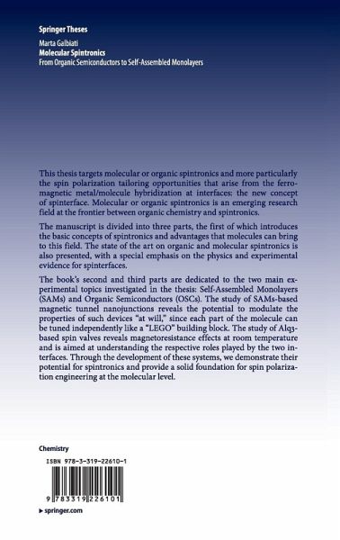 The book's second and third parts are dedicated to the two main experimental topics investigated in the thesis: Self-Assembled Monolayers (SAMs) and Organic Semiconductors (OSCs). The study of SAMs-based magnetic tunnel nanojunctions reveals the potential to modulate the properties of such devices "at will,"since each part of the molecule can be tuned independently like a "LEGO" building block. The study of Alq3-based spin valves reveals magnetoresistance effects at room temperature and is aimed at understanding the respective roles played by the two interfaces. Through the development of these systems, we demonstrate their potential for spintronics and provide a solid foundation for spin polarization engineering at the molecular level.