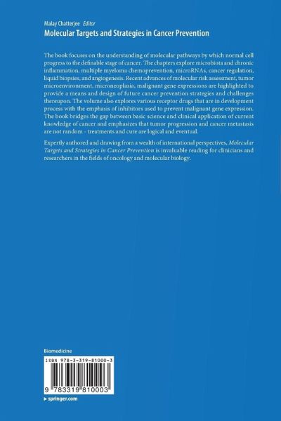 Strategies to Target Pancreatic Cancer.- MICROBIOTA AND CHRONIC INFLAMMATION AS TARGETS FOR COLORECTAL CANCER PREVENTION.- Challenges in multiple myeloma chemoprevention: potential role of natural, synthetic and endogenous molecules.- Targeting MicroRNAs: Molecular basis of cancer prevention.- A new level of complexity in cancer regulation and a promising source of biomarkers: The liquid biopsies.- Targeting Tumor Angiogenesis for Cancer Prevention.- Molecular Targets and Strategies in Cancer Prevention