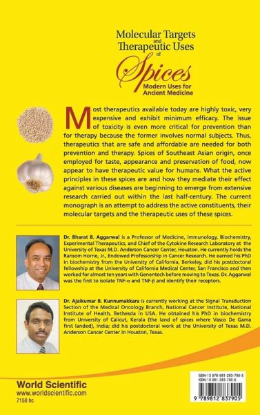 Most therapeutics available today are highly toxic, very expensive and exhibit minimum efficacy. The issue of toxicity is even more critical for prevention than for therapy because the former involves normal subjects. Thus, therapeutics that are safe and affordable are needed for both prevention and therapy. Spices of Southeast Asian origin, once employed for taste, appearance and preservation of food, now appear to have therapeutic value for humans. What the active principles in these spices are and how they mediate their effect against various diseases are beginning to emerge from extensive research carried out within the last half-century. The current monograph is an attempt to address the active constituents, their molecular targets and the therapeutic uses of these spices.