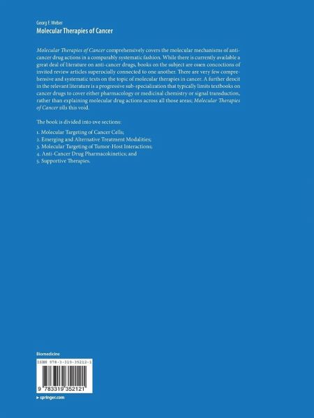 Molecular Therapies of Cancer comprehensively covers the molecular mechanisms of anti-cancer drug actions in a comparably systematic fashion. While there is currently available a great deal of literature on anti-cancer drugs, books on the subject are often concoctions of invited review articles superficially connected to one another. There is a lack of comprehensive and systematic text on the topic of molecular therapies in cancer. A further deficit in the relevant literature is a progressive sub-specialization that typically limits textbooks on cancer drugs to cover either pharmacology or medicinal chemistry or signal transduction, rather than explaining molecular drug actions across all those areas; Molecular Therapies of Cancer fills this void. The book is divided into five sections: 1. Molecular Targeting of Cancer Cells; 2. Emerging and Alternative Treatment Modalities; 3. Molecular Targeting of Tumor-Host Interactions; 4. Anti-Cancer Drug Pharmacokinetics; and 5. Supportive Therapies.