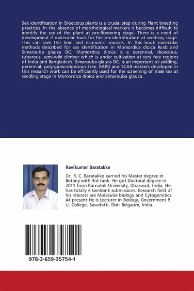 Sex identification in Dioecious plants is a crucial step during Plant breeding practices. In the absence of morphological markers it becomes difficult to identify the sex of the plant at pre-flowering stage. There is a need of development if molecular tools for the sex identification at seedling stage. This can save the time and economic sources. In this book molecular methods described for sex identification in Momordica dioica Roxb and Simarouba glauca DC. Momordica dioica is a perennial, dioecious, tuberous, semi-wild climber which is under cultivation at very few regions of India and Bangladesh. Simarouba glauca DC. is an important oil yielding, perennial, poly-gamo-dioecious tree. RAPD and SCAR markers developed in this research work can be efficiently used for the screening of male sex at seedling stage in Momordica dioica and Simarouba glauca.