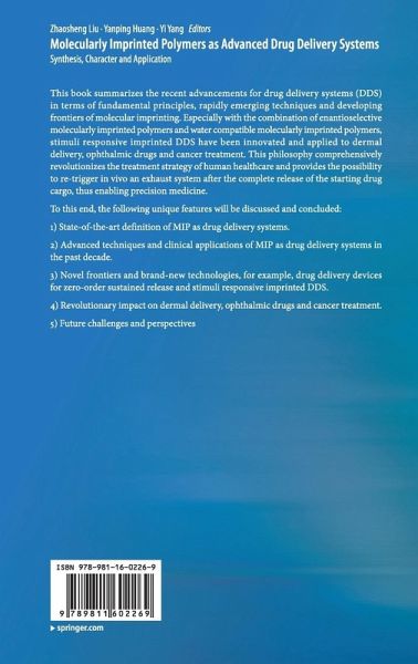 This book summarizes the recent advancements for drug delivery systems (DDS) in terms of fundamental principles, rapidly emerging techniques and developing frontiers of molecular imprinting. Especially with the combination of enantioselective molecularly imprinted polymers and water compatible molecularly imprinted polymers, stimuli responsive imprinted DDS have been innovated and applied to dermal delivery, ophthalmic drugs and cancer treatment. This philosophy comprehensively revolutionizes the treatment strategy of human healthcare and provides the possibility to re-trigger in vivo an exhaust system after the complete release of the starting drug cargo, thus enabling precision medicine.