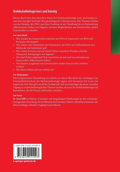 Dieses Buch fasst den aktuellen Stand der Molekularbiologie kurz und knapp zusammen und gibt Auskunft über grundlegende Lebensprozesse. Die Themen reichen von der Struktur der DNA und ihrer Funktion in der Vererbung bis zur Entwicklung differenzierter Zellen von Organen und den Möglichkeiten, aus Gewebezellen wieder Stammzellen zu erhalten.