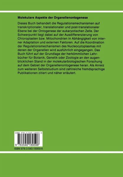 Behandelt werden die Regulationsmechanismen auf der Ebene der Transkription, Translation und Posttranslation, die die Entwicklung der Organellen in eukaryotischen Zellen bestimmen. Der Schwerpunkt liegt dabei auf der Ausdifferenzierung von Chloroplasten und Mitochondrien in Abhängigkeit von interner Adaptation und externen Faktoren. Auf die Koordination der Regulationssignale des Kerns mit denen der Organellen wird ausführlich eingegangen. Das Buch führt auf der Grundlage der herkömmlichen Lehrbücher für Botanik, Genetik oder Zoologie an den augenblicklichen Stand in der molekularbiologischen Forschung auf dem Gebiet der Organellenontogenese heran. Als Anreiz zum weiteren Selbststudium sind zahlreiche fremdsprachige Publikationen zitiert und näher erläutert.