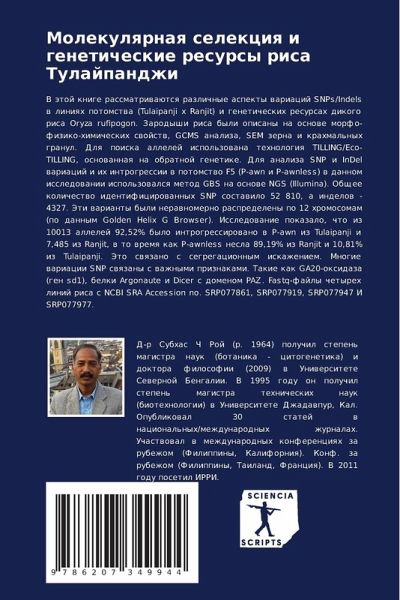V ätoj knige rassmatriwaütsq razlichnye aspekty wariacij SNPs/Indels w liniqh potomstwa (Tulaipanji x Ranjit) i geneticheskih resursah dikogo risa Oryza rufipogon. Zarodyshi risa byli opisany na osnowe morfo-fiziko-himicheskih swojstw, GCMS analiza, SEM zerna i krahmal'nyh granul. Dlq poiska allelej ispol'zowana tehnologiq TILLING/Eco-TILLING, osnowannaq na obratnoj genetike. Dlq analiza SNP i InDel wariacij i ih introgressii w potomstwo F5 (P-awn i P-awnless) w dannom issledowanii ispol'zowalsq metod GBS na osnowe NGS (Illumina). Obschee kolichestwo identificirowannyh SNP sostawilo 52 810, a indelow - 4327. Jeti warianty byli nerawnomerno raspredeleny po 12 hromosomam (po dannym Golden Helix G Browser). Issledowanie pokazalo, chto iz 10013 allelej 92,52% bylo introgressirowano w P-awn iz Tulaipanji i 7,485 iz Ranjit, w to wremq kak P-awnless nesla 89,19% iz Ranjit i 10,81% iz Tulaipanji. Jeto swqzano s segregacionnym iskazheniem. Mnogie wariacii SNP swqzany s wazhnymi priznakami. Takie kak GA20-oxidaza (gen sd1), belki Argonaute i Dicer s domenom PAZ. Fastq-fajly chetyreh linij risa s NCBI SRA Accession no. SRP077861, SRP077919, SRP077947 I SRP077977.