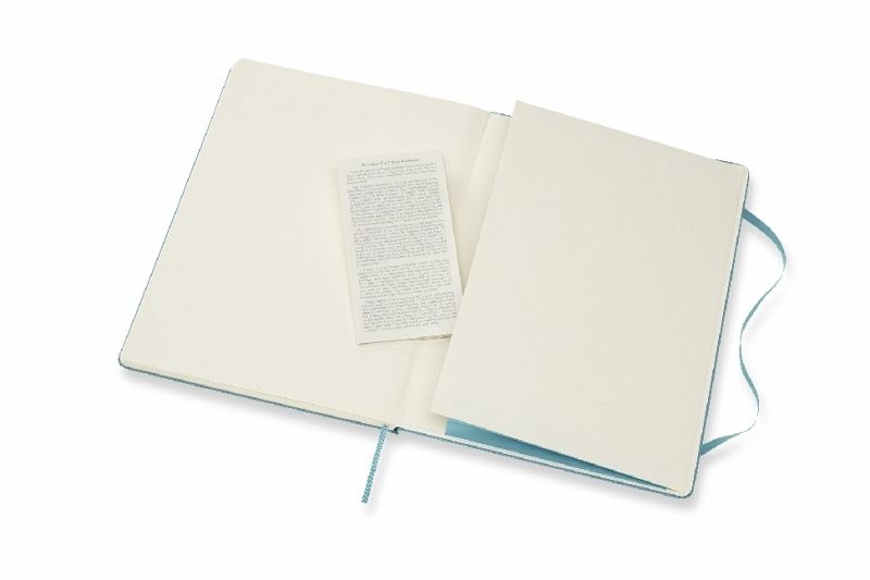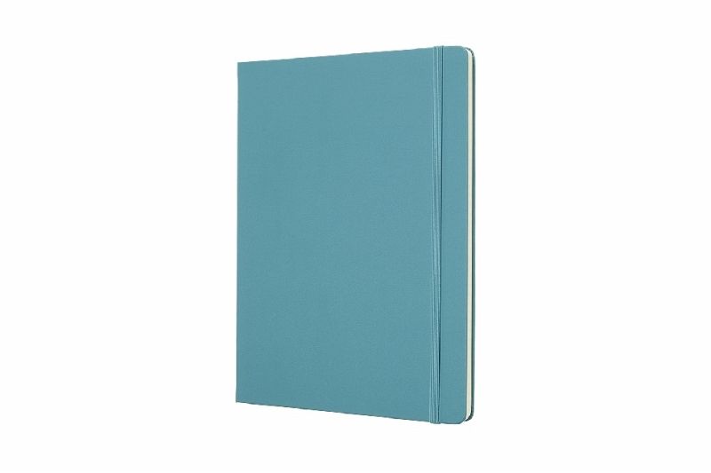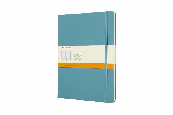 Moleskine's classic hardcover notebook - in an extra large size - with an arresting reef blue cover. This notebook has a hard cover with themed graphics and details, rounded corners, elastic closure; includes a sheet of themed stickers, ribbon bookmark, expandable inner pocket in cardboard and cloth with themed endpapers. Extra large sized 25 x 19 cm, with ruled pages.