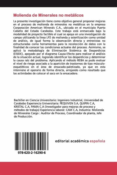 La presente investigación tiene como objetivo general proponer mejoras en el proceso de molienda de minerales no metálicos en la empresa Corporación American Minerals C.A., ubicada en el municipio Puerto Cabello del Estado Carabobo. Este trabajo está enmarcado bajo la modalidad de proyecto factible el cual se apoya en una investigación de campo utilizando la línea LP2 de molienda y esterilización como unidad de análisis, de igual forma la observación directa y entrevistas no estructuradas como herramientas para la recolección de datos con la finalidad de conocer las condiciones actuales del proceso. Asimismo, se aplicó la metodología de Eliminación Sistémica de Desperdicios (ESIDE), apoyado por el diagrama Causa-Efecto para realizar el análisis de la situación actual, logrando identificar los desperdicios y determinar la causa raíz del problema. Aplicando el método REBA se pudo evaluar el nivel de riesgo asociado a la aparición de trastornos de tipo músculo-esqueléticos en el área de ensacado-paletizado, ya que en esta interviene el operario de forma directa, arrojando como resultado que las actividades de colocar el saco en la ensacadora.