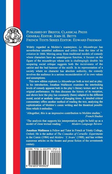 Widely regarded as Moliere's masterpiece, Le Misanthrope has nevertheless unsettled audiences and critics for the time of its publication in 166. Moving away from traditional models of comedy where characters have an unambiguous function it focuses on the figure of the misanthrope whose role is challengingly double - his unsparing social critique suggests both the incisiveness of the satirist and the bad humour of the misfit. In its representation of a society where no character has absolute authority the comedy involves the audience in a serious reconsideration of its own values and assumptions. This new edition explores Le Misanthrope as a text and play. In his introduction, Jonathan Mallinson examines the interlocking levels of comedy apparently both in the play's literary texture and in the original performance. It then discusses the history of its reception and shows how the play has been constantly adapted to the different moral social or aesthetic values of changing times. A detailed critical commentary offers another method of reading the text, analysing the sophistication of Moliere's comic writing and the theatrical possibiltieis it embodies.