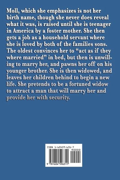 Moll, which she emphasizes is not her birth name, though she never does reveal what it was, is raised until she is teenager in America by a foster mother. She then gets a job as a household servant where she is loved by both of the families sons. The oldest convinces her to "act as if they where married" in bed, but then is unwilling to marry her, and pawns her off on his younger brother. She is then widowed, and leaves her children behind to begin a new life. She pretends to be a fortuned widow to attract a man that will marry her and provide her with security.