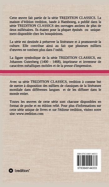 Cette uvre (édition relié) fait partie de la série TREDITION CLASSICS. La maison d édition tredition, basée à Hambourg, a publié dans la série TREDITION CLASSICS des ouvrages anciens de plus de deux millénaires. Ils étaient pour la plupart épuisés ou uniquement disponible chez les bouquinistes. La série est destinée à préserver la littérature et à promouvoir la culture. Avec sa série TREDITION CLASSICS, tredition à comme but de mettre à disposition des milliers de classiques de la littérature mondiale dans différentes langues et de les diffuser dans le monde entier.