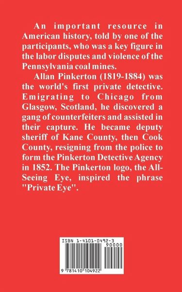 An important resource in American history, told by one of the participants, who was a key figure in the labor disputes and violence of the Pennsylvania coal mines. Allan Pinkerton (1819-1884) was the world's first private detective. Emigrating to Chicago from Glasgow, Scotland, he discovered a gang of counterfeiters and assisted in their capture. He became deputy sheriff of Kane County, then Cook County, resigning from the police to form the Pinkerton Detective Agency in 1852. The Pinkerton logo, the All-Seeing Eye, inspired the phrase "Private Eye".