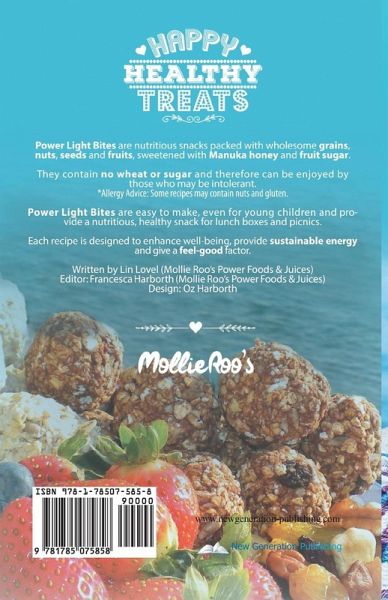 Power Light Bites are nutritious snacks packed with wholesome grains, nuts, seeds and fruits, sweetened with Manuka honey and fruit sugar. They contain no wheat or sugar and therefore can be enjoyed by those who may be intolerant. *Allergy Advice: Some recipes may contain nuts and gluten. Power Light Bites are easy to make, even for young children and provide a nutritious, healthy snack for lunch boxes and picnics. Each recipe is designed to enhance well-being, provide sustainable energy and give a feel-good factor. Written by Lin Lovel (Mollie Roo's Power Foods & Juices) Editor: Francesca Harborth (Mollie Roo's Power Foods & Juices) Design: Oz Harborth