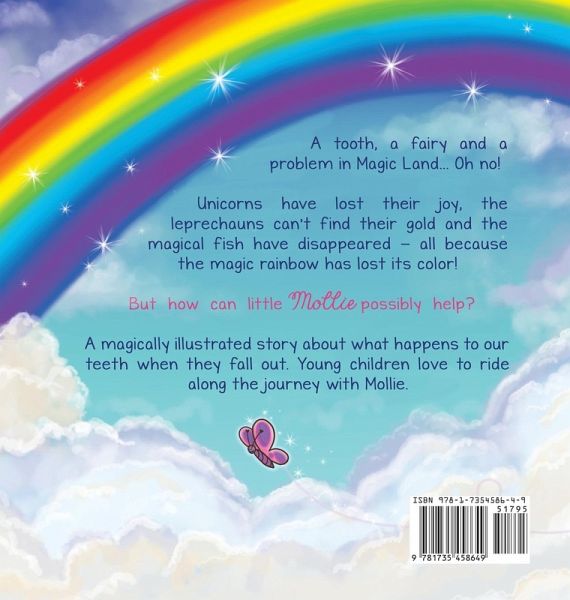 A tooth, a fairy and a problem in Magic Land... Oh no! Unicorns have lost their joy, the leprechaun can't find his gold, and the magical fish have disappeared - all because the magic rainbow has lost its color! Who can help Magic Land? Mollie, a curious and adventurous girl who has just lost her first tooth, isn't so sure if she should give it to the tooth fairy. She wishes to meet her before she can make her decision and one night, her wish becomes true. Little does she know that this encounter will take her on the biggest adventure in her life. Can Mollie help Miss Pearlwirl, the tooth fairy, to get the colors of the rainbow back? Does she need to give away her tooth? In this exciting adventure, Mollie will need all her creativity and imagination to help her friends and bring back happiness to Magic Land. A magically illustrated story about what happens to our teeth when they fall out, young children will love to ride along on the journey with Mollie. Mollie's Magical Tooth is designed to spark your child's imagination and fill them with wonder, making it a brilliant story to add to your collection. Kids will be excited to color some partly colored pages in the book and help Mollie bring back the colors with their creativity and imagination.