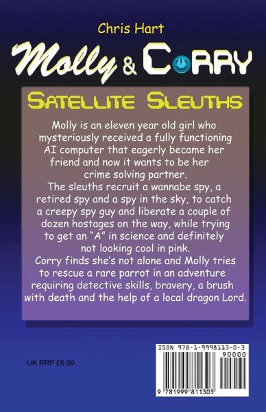 Molly is an eleven year old girl whose best friend is a fully functioning A.I. computer called Corry. In their second great adventure they're on a mission to rescue a lost pet and as she finds out more Molly becomes convinced a crime has been committed. She even thinks she knows who did it. Corry gains the ability to see and creates a whole new set of problems for Molly. Dad proves he's a hero, risking life and limb and somehow, so does Molly's brother Tom. The duo become sleuths to investigate and bring the culprit to justice. They recruit a wannabe spy, a retired spy and a spy in the sky, to catch a creepy spy guy and liberate a couple of dozen hostages on the way, while trying to get an "A" in science with Lizzie and definitely not looking cool in pink. Corry discovers she's not alone and like most families they have their own problems, but usually ours can be fixed without space flight. At school Riley's still a pain and it looks like Jazzy the class bully has been arrested, but looks can be deceiving. Molly and Corry conquer the perils of space and dare a rescue in an adventure requiring detective skills, bravery, a brush with death and the help of a local dragon Lord (retired)... and of course, dad.