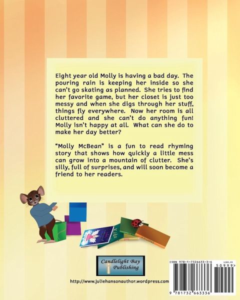 Meet Molly McBean! Molly McBean wears her hair in tails and clashing colored clothes. Her big feet make her clumsy, and her socks have holey toes. The morning had just begun and Molly is already having a bad day. The pouring rain is keeping her inside so she can't go skating as planned. She tries to find her favorite game but her closet is just too messy and when she digs through her stuff, things fly everywhere. Now her room is all cluttered and she can't do anything fun. Molly isn't happy at all! Molly McBean Clutterbug Queen is a fun-to-read rhyming story. Cleverly written, it shows how quickly a mess can grow into a mountain of clutter. When mom sees that Molly's room is a total disaster, she instructs her to clean it up. But Molly goes about it the wrong way. She shoves everything back into the closet and piles stuff high up to the sky; wall to wall, ceiling to floor. See what Molly does when her closet begins to bulge because it's packed too full. In this entertainingly funny and heartwarming book, Molly McBean shows the value and importance of being responsible, sharing, and the bond of true friendship. Full of surprises, Molly will delight her audience and soon be a friend to her readers. A valuable tool... This book is a valuable teaching tool to help kids organize and prioritize which will help them decide which things to keep and what to give away. And for suggestions please check out Molly's 'helpful hints' page at the end of the book. It will help to de-clutter the FUN WAY! Find Molly's mouse... Molly has an adorable pet mouse that got out of its house and it's hiding on every page. It's a fun exercise and kids will love looking for it. But the mouse needs a name! So when you find it, please think of one. There's a place in the front of the book for the name you choose. Illustrated in great detail... Beautifully illustrated and in great detail by the author Julie Hanson, Molly McBean Clutterbug Queen will inspire children to be mindful of how they care for their things. It will make the perfect gift for birthdays, holidays and other occasions. Your child will surely connect with Molly McBean. Parents will love her too! Target audience is children ages 3 - 8.