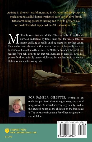 Activity in the spirit world increased in October, and the protective shield around Molly's house weakened each day. Molly's family felt a foreboding presence lurking and tried to prepare. No one predicted what happened on All Hallows Eve, 1961. Molly's beloved teacher, Mother Theresa, falls ill, so Dennis Burn, an undertaker by trade, takes over for her. He takes an instant disliking to Molly until he meets her mother, Anna. He soon becomes obsessed with Anna and the rest of the family and tries to insinuate himself into their lives. For Molly, he becomes the substitute teacher from hell. It turns out that Mr. Burn has an identical twin in a prison for the criminally insane. Molly and her mother begin to wonder if they locked up the wrong twin.