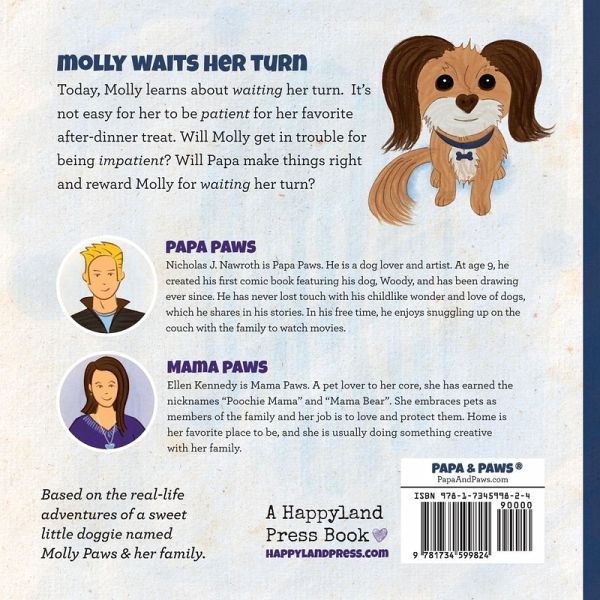 Every pup knows the excitement of treat time - especially Molly Paws! In this charming tale based on true events, this sweet little doggie learns an important lesson about patience while waiting for her favorite after-dinner treat. Little ones will giggle at Molly's wiggles and squirms as she tries her very best to wait her turn. Through Papa's gentle guidance, children will discover alongside Molly that good things come to those who wait! Perfect for toddlers and preschoolers ages 0-5, this delightful story helps young readers learn about patience through adorable illustrations and relatable moments that will have the whole family smiling. Each book in The Everyday Adventures of Papa & Paws® series features:Charming illustrations that capture every emotional moment Age-appropriate storytelling perfect for ages 0-5 Real-life situations that children instantly relate to Gentle life lessons woven naturally into each tale True stories that make the messages even more meaningful Opportunities for family bonding and discussion
