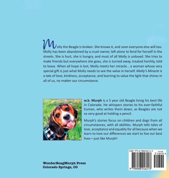 Discover the heartwarming journey of Molly, a beagle facing abandonment. Bearing the scars of neglect from her family's mistreatment, Molly's world is a lonely one, filled with hunger and devoid of affection. Each attempt at friendship is met with rejection, deepening her sense of despair. But fate has a twist in store. In "Molly's Miracle," we witness the transformative power of love and acceptance through the eyes of a dog who believes she is beyond repair. Molly's life takes an unexpected turn when she encounters a girl with an extraordinary gift. This girl sees beyond Molly's brokenness, igniting a spark of hope and revealing the inherent value within her. This tale is more than a story of survival; it's a testament to the resilience of the spirit and the unbreakable bonds that can form between us. "Molly's Miracle" celebrates the light that exists in all beings, regardless of their past, and the incredible power of kindness to change lives. Join Molly on her inspiring journey towards love, belonging, and self-discovery.