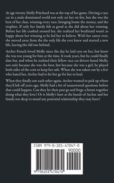At twenty, Molly Pritchard was at the top of her game. Driving a race car in a male-dominated world not only set her on fire, but she was the best of her class, winning every race, bringing home the money, and the trophies. If only her family felt as good as she did about her winning. Before her life crashed around her, she realized her boyfriend wasn't as happy about her winning as he led her to believe. With her career over, she moved away from the life she knew and started a new life, leaving the old one behind. Archer French had loved Molly since the day he laid eyes on her, but knew she was too young for him at the time. It took years, but when he could finally date her, he realized their fellow race car drivers hated Molly, not only because she won every race, but because she was a girl. He played both sides of the coin to keep her safe. When these men played a part in ending Molly's career, Archer had to let her go for her to heal. Years later when they finally saw each other again, Archer wanted to pick up where they'd left off years ago, Molly had a lot of unanswered questions before that could happen. Can they let their past go and forge a future together doing what they love? Or is Molly's hurt at the hand of Archer and her family too deep to mend any potential relationship they may forge?