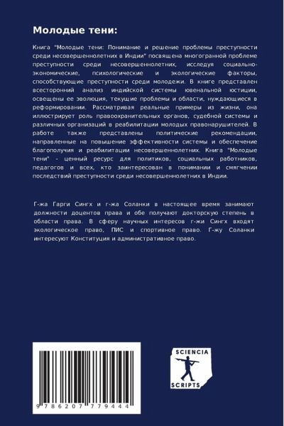Kniga "Molodye teni: Ponimanie i reshenie problemy prestupnosti sredi nesowershennoletnih w Indii" poswqschena mnogogrannoj probleme prestupnosti sredi nesowershennoletnih, issleduq social'no-äkonomicheskie, psihologicheskie i äkologicheskie faktory, sposobstwuüschie prestupnosti sredi molodezhi. V knige predstawlen wsestoronnij analiz indijskoj sistemy üwenal'noj üsticii, oswescheny ee äwolüciq, tekuschie problemy i oblasti, nuzhdaüschiesq w reformirowanii. Rassmatriwaq real'nye primery iz zhizni, ona illüstriruet rol' prawoohranitel'nyh organow, sudebnoj sistemy i razlichnyh organizacij w reabilitacii molodyh prawonarushitelej. V rabote takzhe predstawleny politicheskie rekomendacii, naprawlennye na powyshenie äffektiwnosti sistemy i obespechenie blagopoluchiq i reabilitacii nesowershennoletnih. Kniga "Molodye teni" - cennyj resurs dlq politikow, social'nyh rabotnikow, pedagogow i wseh, kto zainteresowan w ponimanii i smqgchenii posledstwij prestupnosti sredi nesowershennoletnih w Indii.