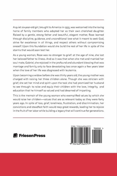 A quiet six-year-old girl, brought to America in 1955, was welcomed into the loving home of family members who adopted her as their own cherished daughter. Raised by a gentle, strong father and beautiful, elegant mother, Rose learned through discipline, guidance, and unconditional love what it meant to seek God, strive for excellence in all things, and respect others without compromising oneself. Upon this foundation would she build the rest of her life in spite of the storms that would soon test her. As a young woman, Rose was no stranger to grief: at the age of nine, she lost her beloved father to illness. And so it was that when she met and married her soul mate, Gabriel, she rejoiced in the profound and abundant blessing that was marriage and family, only to face devastating loss once again a few years later when the love of her life was diagnosed with leukemia. Upon becoming a widow before she was thirty years old, the young mother was charged with raising her three children alone. Though she was stricken with grief, she set her mind and spirit upon the task she had promised her husband to see through: to raise and equip their children with the love, integrity, and education that he himself so valued and had dreamed of imparting. This is the memoir of the young woman who exemplified values by which she would raise her children-values that are as relevant today as they were forty years ago. In spite of loss, grief, loneliness, frustration, and discrimination, her convictions and steadfast faith would reap great rewards, leading her to rejoice in the fruit of her labor while building a legacy that will continue for generations.