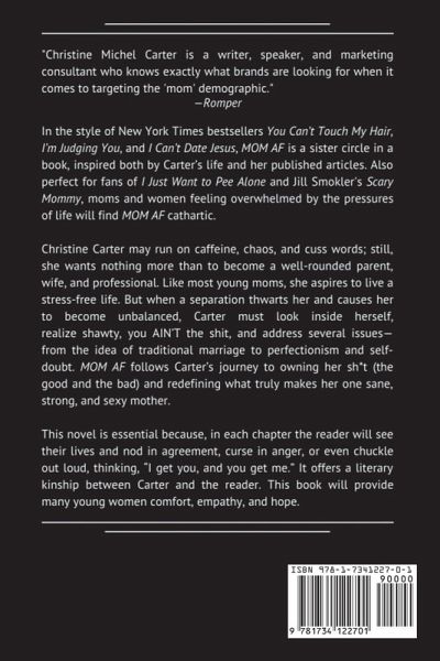A MUST-READ FOR ALL MOMS OUT THERE! Being in a single-parent situation comes with its own set of challenges, and this book is here to show you the real journey of being a mother and having a career, and help you to relate to it in a fun and entertaining way. Christine Carter may run on caffeine, chaos, and cuss words, but she wants nothing more than to become a well-rounded parent, wife, and professional. Like most young moms, she aspires to live a stress-free life. But when her world becomes unbalanced, and a separation thwarts her, Carter must look inside herself, realize shawty, you AIN'T the sh*t, and address several issues- from the idea of traditional marriage to perfectionism to self-doubt. MOM AF follows Carter's journey to owning her sh*t (the good and the bad) and redefining what truly makes her one sane, strong, and sexy mother.