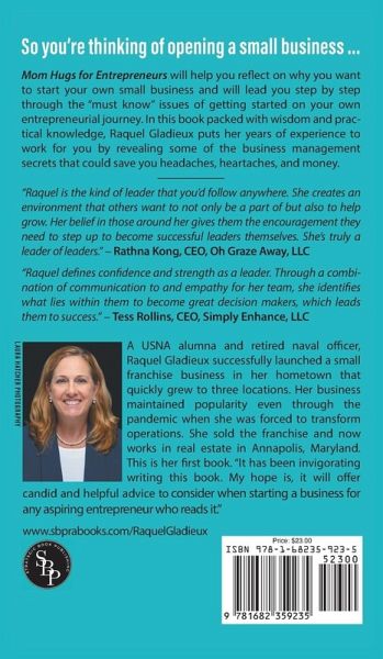 So you're thinking of opening a small business ... Mom Hugs for Entrepreneurs will help you reflect on why you want to start your own small business and will lead you step by step through the "must know" issues of getting started on your own entrepreneurial journey. In this book packed with wisdom and practical knowledge, Raquel Gladieux puts her years of experience to work for you by revealing some of the business management secrets that could save you headaches, heartaches, and money. ___________ "Raquel is the kind of leader that you'd follow anywhere. She creates an environment that others want to not only be a part of but also to help grow. Her belief in those around her gives them the encouragement they need to step up to become successful leaders themselves. She's truly a leader of leaders." - Rathna Kong, CEO, Oh Graze Away, LLC "Raquel defines confidence and strength as a leader. Through a combination of communication to and empathy for her team, she identifies what lies within them to become great decision makers, which leads them to success." - Tess Rollins, CEO, Simply Enhance, LLC ¿USNA alumna and retired naval officer, Raquel Gladieux successfully launched a small franchise business in her hometown that quickly grew to three locations. Her business maintained popularity even through the pandemic when she was forced to transform operations. She sold the franchise and now works in real estate in Annapolis, Maryland. This is her first book. "It has been invigorating writing this book. My hope is, it will offer candid and helpful advice to consider when starting a business for any aspiring entrepreneur who reads it."