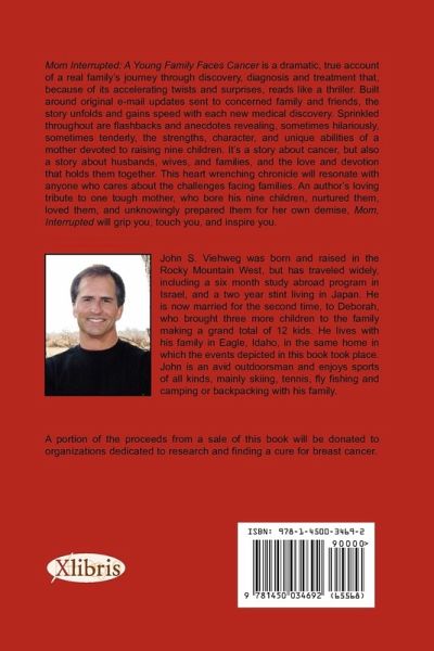 Mom Interrupted: A Young Family Faces Cancer is a dramatic, true account of a real family's journey through discovery, diagnosis and treatment that, because of its accelerating twists and surprises, reads like thriller. Built around original e-mail updates sent to concerned family and friends, the story unfolds and gains speed with each new medical discovery. Sprinkled throughout are flashbacks and anecdotes revealing, sometimes hilariously, sometimes tenderly, the strengths, character, and unique abilities of a mother devoted to raising nine children. It's a story about cancer, but also a story about husbands, wives, and families, and the love and devotion that holds them together. This heart wrenching chronicle will resonate with anyone who cares about the challenges facing families. An author's loving tribute to one tough mother, who bore his nine children, nurtured them, loved them, and unknowingly prepared them for her own demise. Mom, Interrupted will grip you, touch you, and inspire you. A portion of book sale proceeds will be donated to cancer research and support organizations.
