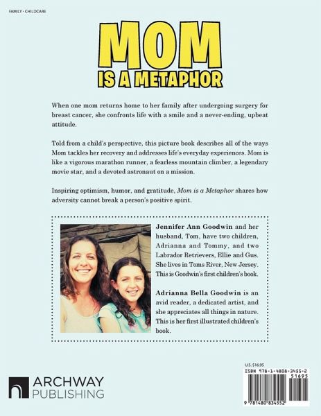 When one mom returns home to her family after undergoing surgery for breast cancer, she confronts life with a smile and a never-ending, upbeat attitude. Told from a child’s perspective, this picture book describes all of the ways Mom tackles her recovery and addresses life’s everyday experiences. Mom is like a vigorous marathon runner, a fearless mountain climber, a legendary movie star, and a devoted astronaut on a mission. Inspiring optimism, humor, and gratitude, Mom is a Metaphor shares how adversity cannot break a person’s positive spirit.