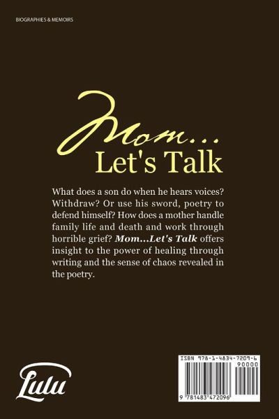 Poetry by Robert Mark Schaeberle, Memoir by Jeanne Schaeberle What does a son do when he hears voices? Withdraw? Or use his sword, poetry to defend himself? How does a mother handle family life and death and work through horrible grief? Mom...Let's Talk offers insight to the power of healing through writing and the sense of chaos revealed in the poetry.