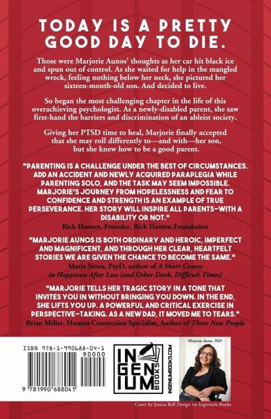 Today is a pretty good day to die. Those were Marjorie Aunos's thoughts as her car hit black ice and spun out of control toward an oncoming truck. As she waited for paramedics to extricate her from the mangled wreck, unable to feel anything below her neck, she pictured her sixteen-month-old son. And decided to live. So began the most challenging chapter in the life of this overachieving psychologist and single parent, whose life's work had been to advocate for parents with intellectual disabilities to help them keep custody of their children. Marjorie's spinal cord injury thrust her into a life as a newly-disabled parent, experiencing first hand the barriers and discrimination she'd witnessed for others. She became one of those moms who wondered when child welfare officials would knock on the door with an apprehension order for her to give up her child. In a remarkably short few months, determined not to let the accident take her professional identity, Marjorie returned to work-in her wheelchair. There, the strategies that had served her well before were ineffective. In fact, they were making things worse. As a clinical psychologist, she told herself... She should have been able to prevent her own depression, anxiety, and post-trauma. She should have been able to reframe and rehabilitate herself. She should have gone into post-traumatic growth and not post-traumatic disorder. The should-haves fuelled deep shame and disappointment, which, in turn, increased her suffering. But there were even bigger challenges. Five days after the accident, she asked her parents to bring her son to the hospital. Thomas was frightened by the tubes and beeping machines. He refused to touch her, hug her, or sit beside her. Marjorie felt hurt that she couldn't be there for him and that he kept turning to his grandma for comfort. For years she'd dreamed about becoming a mother-not just any mother, but a great mother. An active mother, a role model mother. Marjorie plunged further into helplessness and powerlessness, her concept of perfect motherhood shattered on that Quebec roadway. And the child she'd worked so hard for being taken care of by others in a way that she couldn't. How can you be a good parent if you can't bend down to tie your child's shoes or scoop them into your arms for a hug or keep them safe at bath time without supervision? Does this make you a bad parent? Between physical therapy rehabilitation, new day-to-day logistics, battles with an insurance company, ongoing physical pain and pain management, Marjorie had to start over as a parent too. And she did. Giving her PTSD time to heal, Marjorie mastered co-parenting 101 with her parents, prioritizing self-care, and-something she'd never done before as an overachiever-learned how to ask for help because parenting is hard work. Marjorie finally accepted about herself what she believed about her former clients, those parents with disabilities: she may roll differently to-and with-her son but she already knew how to be a good parent.
