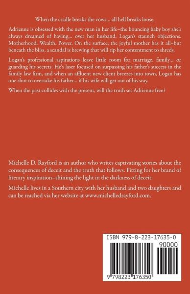 When the cradle breaks the vows... all hell breaks loose. Adrienne is obsessed with the new man in her life-the bouncing baby boy she's always dreamed of having... over her husband, Logan's staunch objections. Motherhood. Wealth. Power. On the surface, the joyful mother has it all-but beneath the bliss, a scandal is brewing that will rip her contentment to shreds. Logan's professional aspirations leave little room for marriage, family... or guarding his secrets. He's laser focused on surpassing his father's success in the family law firm, and when an affluent new client breezes into town, Logan has one shot to overtake his father... if his wife will get out of his way. When the past collides with the present, will the truth set Adrienne free?