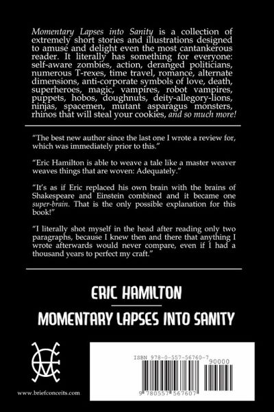 Momentary Lapses into Sanity is a collection of extremely short stories and illustrations designed to amuse and delight even the most cantankerous reader. It literally has something for everyone: self-aware zombies, action, deranged politicians, numerous T-rexes, time travel, romance, alternate dimensions, anti-corporate symbols of love, death, superheroes, magic, vampires, robot vampires, puppets, hobos, doughnuts, deity-allegory-lions, ninjas, spacemen, mutant asparagus monsters, rhinos that will steal your cookies, and so much more!