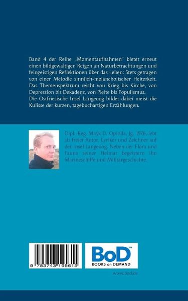 Mit Band 4 der Reihe "Momentaufnahmen" legt Mayk D. Opiolla erneut eine Liebeserklärung an seine Wahlheimat Langeoog vor. 32 neue Geschichten bieten einen bildgewaltigen Reigen an Naturbetrachtungen und feingeistigen Reflektionen über das Leben; immer getragen von einer Melodie sinnlich-melancholischer Heiterkeit. Das Themenspektrum ist groß: Während langer Streifzüge durch die Inselnatur gibt sich der Ich-Erzähler in gewohnter Manier Tagträumen, Erinnerungen und Gedankenspielen hin. Überlegungen zu politischen und gesellschaftlichen Themen reihen sich dabei an lakonisch aufbereitete Beziehungsdesaster oder die subtile Beschreibung romantisch-zarter Bande; das Suchen und Finden von Gott ist ebenso Thema wie die Vermüllung der Meere, der Status der Bundeswehr oder die Frisur von Donald Trump. Und was hat eigentlich die ostfriesische Teezeremonie mit einem Priestergewand zu tun, was ein Brauhaus zu Jever mit Emanzipation? Mayk D. Opiolla schlägt auch dort Brücken, wo es auf den ersten Blick keinen Kontext zu geben scheint. Wir erfahren von männlicher Midlife-Crisis, von Depression, Winterstürmen, Verrat und Entfremdung, aber auch von Freundschaft, Vergebung, Geborgenheit und dem Wunder des Neuanfangs.