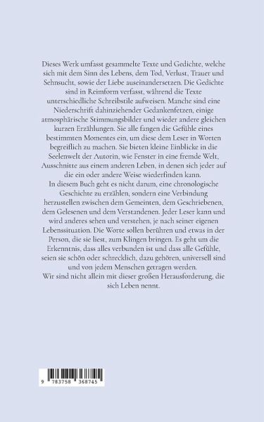 Dieses Werk umfasst gesammelte Texte und Gedichte, welche sich mit dem Sinn des Lebens, dem Tod, Verlust, Trauer und Sehnsucht, sowie der Liebe auseinandersetzen. Die Gedichte sind in Reimform verfasst, während die Texte unterschiedliche Schreibstile aufweisen. Manche sind eine Niederschrift dahinziehender Gedankenfetzen, einige atmosphärische Stimmungsbilder und wieder andere gleichen kurzen Erzählungen. Sie alle fangen die Gefühle eines bestimmten Momentes ein, um diese dem Leser in Worten begreiflich zu machen. Sie bieten kleine Einblicke in die Seelenwelt der Autorin, wie Fenster in eine fremde Welt, Ausschnitte aus einem anderen Leben, in denen sich jeder auf die ein oder andere Weise wiederfinden kann. In diesem Buch geht es nicht darum, eine chronologische Geschichte zu erzählen, sondern eine Verbindung herzustellen zwischen dem Gemeinten, dem Geschriebenen, dem Gelesenen und dem Verstandenen. Jeder Leser kann und wird anderes sehen und verstehen, je nach seiner eigenen Lebenssituation. Die Worte sollen berühren und etwas in der Person, die sie liest, zum Klingen bringen. Es geht um die Erkenntnis, dass alles verbunden ist und dass alle Gefühle, seien sie schön oder schrecklich, dazu gehören, universell sind und von jedem Menschen getragen werden. Wir sind nicht allein mit dieser großen Herausforderung, die sich Leben nennt.