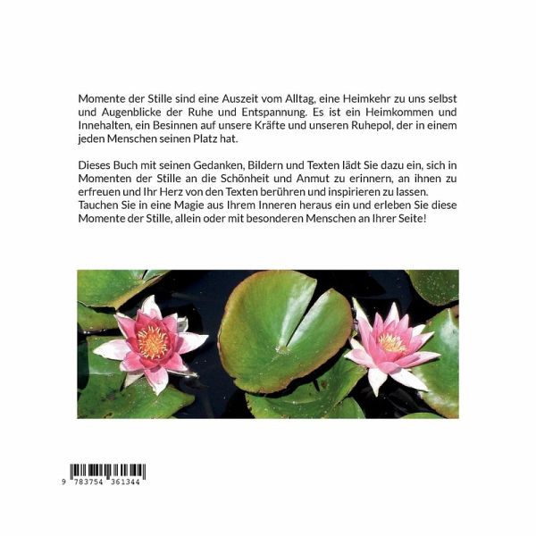 Momente der Stille sind eine Auszeit vom Alltag, eine Heimkehr zu uns selbst und Augenblicke der Ruhe und Entspannung. Es ist ein Heimkommen und Innehalten, ein Besinnen auf unsere Kräfte und unseren Ruhepol, der in einem jeden Menschen seinen Platz hat.Dieses Buch mit seinen Gedanken, Bildern und Texten lädt Sie dazu ein, sich in Momenten der Stille an die Schönheit und Anmut zu erinnern, an ihnen zu erfreuen und Ihr Herz von den Texten berühren und inspirieren zu lassen.Tauchen Sie in eine Magie aus Ihrem Inneren heraus ein und erleben Sie diese Momente der Stille, allein oder mit besonderen Menschen an Ihrer Seite!