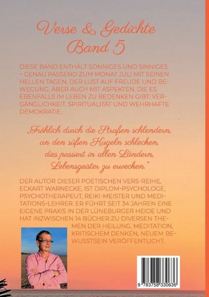 Der Autor Eckart Warnecke, seit 1988 verheiratet, ist in erster Linie Psychotherapeut und arbeitet seit 1990 in eigener Praxis mit Menschen. Seit 1996 ist er auch als Buchschreiber tätig. So zählen sein Bestseller Reiki - Der zweite Grad, Feng Shui und Praxisbuch des Magischen Wohnens zu Bestsellern. In der letzten Zeit hat er neben zwei Wanderbüchern über die Sächsische Schweiz sowie zwei kritischen Büchern zum Thema der Corona-Maßnahmen sein Talent für Gedichte und Verse entdeckt. Gedichte sind Gedanken, in denen ein Thema verdichtet prosaisch betrachtet wird. Für Warnecke müssen sich Gedichte reimen, es sind Reime, die ihm am Herzen liegen. Mit der neuartigen Form an Gedichten hat er nichts am Hut. Gute Botschaften sollen Lichtpunkte in den belastenden Alltag bringen, der die Gesellschaft wie eine bleierne Schwere zu überlagern begonnen hat. Überall hört man das Wort Krieg, Hass und Gewalt. Und so entstand dann diese Mischung aus Sonnigem und Sinnigem für den Monat Juli, sozusagen als Nahrung für Geist und Seele. Der Autor findet, am besten würde sich die Lektüre einzelner Verse zum Einschlafen oder noch im Bett kurz vor dem Aufstehen anbieten.