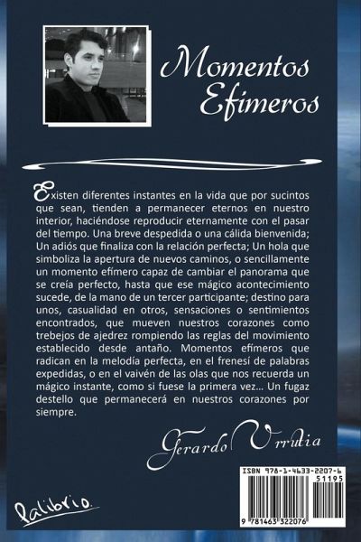 Momentos Efímeros Existen diferentes instantes en la vida que por sucintos que sean, tienden a permanecer eternos en nuestro interior, haciéndose reproducir eternamente con el pasar del tiempo. Una breve despedida o una cálida bienvenida; Un adiós que finaliza con la relación perfecta; Un hola que simboliza la apertura de nuevos caminos, o sencillamente un momento efímero capaz de cambiar el panorama que se creía perfecto, hasta que ese mágico acontecimiento sucede, de la mano de un tercer participante; destino para encontrados, que mueven nuestros corazones como trebejos de ajedrez rompiendo las reglas del movimiento establecido desde antaño. Momentos efímeros que radican en la melodía perfecta, en el frenesí de palabras expedidas, o en el vaivén de las olas que nos recuerda un mágico instante, como si fuese la primera vez... Un fugaz destello que permanecerá en nuestros corazones por siempre. Gerardo Urrutia