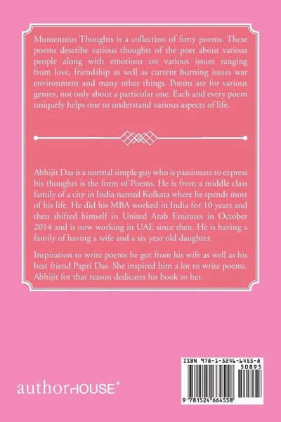 Momentous Thoughts is a collection of forty poems. These poems describe various thoughts of the poet about various people along with emotions on various issues ranging from love, friendship as well as current burning issues war environment and many other things. Poems are for various genres, not only about a particular one. Each and every poem uniquely helps one to understand various aspects of life.