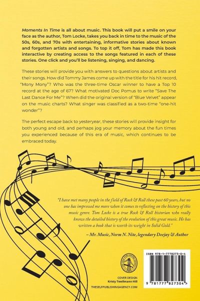 Moments In Time is all about music. This book will put a smile on your face as the author, Tom Locke, takes you back in time to the music of the 50s, 60s, and 70s with entertaining, informative stories about known and forgotten artists and songs. To top it off, Tom has made this book interactive by creating access to the songs featured in each of these stories via the use of QR codes. One click and you'll be listening, singing, and dancing. These stories will provide you with answers to questions about artists and their songs. How did Tommy James come up with the title for his hit record, "Mony Mony"? Who was the three-time Oscar winner to have a Top 10 record at the age of 67? What motivated Doc Pomus to write "Save The Last Dance For Me"? When did the original version of "Blue Velvet" appear on the music charts? What singer was classified as a two-time "one-hit wonder"? The perfect escape back to yesteryear, these stories will provide insight for both young and old, and perhaps jog your memory about the fun times you experienced because of this era of music, which continues to be embraced today. "I have met many people in the field of Rock & Roll these past 60 years, but no one has impressed me more when it comes to reflecting on the history of this music genre. Tom Locke is a true Rock & Roll historian who really knows the detailed history of the evolution of this great music. He has written a book that is worth its weight in Solid Gold." - Mr. Music, Norm N. Nite, legendary Deejay & Author