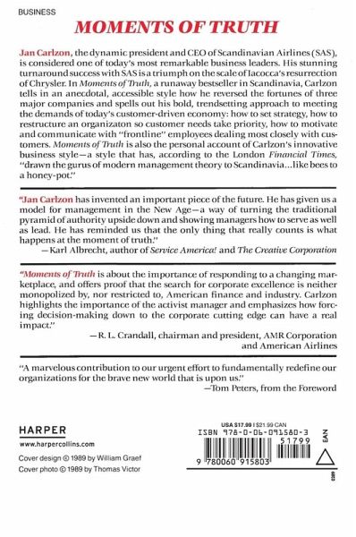 >Jan Carlzon was born in Nykoping, Sweden, in 1941. After receiving his M.B.A. from the Stockholm School of Economics in 1967, he joined Vingresor, Sweden's largest tour operator, first as product manager and later as head of marketing. In 1974, when the package-tour business was in a tailspin because of the first energy crisis, he was named managing director of Vingresor at the age of 32 and soon reversed that company's economic decline. In 1978 he became managing director of Linjeflyg, Sweden's major domestic airline, and in 1981 he took command as resident and chief executive officer of SAS, the consortium of the national airlines of Denmark, Norway, and Sweden. At both Linjeflyg and SAS his leadership turned heavy economic losses into healthy profits within a year. Mr. Carlzon is frequently invited to give talks and interviews worldwide on leadership and customer-oriented business strategies.