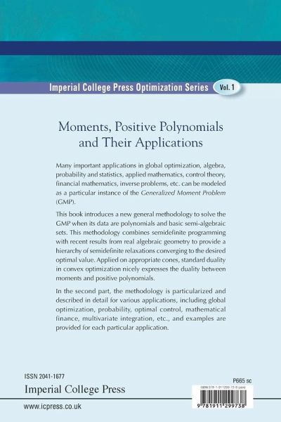 Many important applications in global optimization, algebra, probability and statistics, applied mathematics, control theory, financial mathematics, inverse problems, etc. can be modeled as a particular instance of the Generalized Moment Problem (GMP). This book introduces a new general methodology to solve the GMP when its data are polynomials and basic semi-algebraic sets. This methodology combines semidefinite programming with recent results from real algebraic geometry to provide a hierarchy of semidefinite relaxations converging to the desired optimal value. Applied on appropriate cones, standard duality in convex optimization nicely expresses the duality between moments and positive polynomials. In the second part, the methodology is particularized and described in detail for various applications, including global optimization, probability, optimal control, mathematical finance, multivariate integration, etc., and examples are provided for each particular application.
