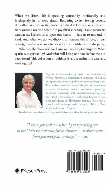 When we listen, life is speaking constantly, profoundly, and intelligently in its every detail. Becoming aware, feeling beyond the coffee cup, tree or the morning light develops a new set of lens, transforming routine habit into joy-filled meaning. These moments wink at us, beckon us to open our hearts - dare us to respond in kind. And when we do, we discover a moment full of love, a feast of insight and a new consciousness for the neighbour and the pansy. What are the "how to's" for living well with joyful purpose? What sparks our spirituality? And what will bring us home before the sun goes down? This collection of writings is about taking the dare and winking back.