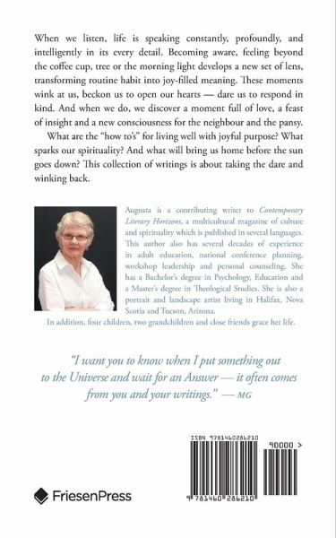 When we listen, life is speaking constantly, profoundly, and intelligently in its every detail. Becoming aware, feeling beyond the coffee cup, tree or the morning light develops a new set of lens, transforming routine habit into joy-filled meaning. These moments wink at us, beckon us to open our hearts - dare us to respond in kind. And when we do, we discover a moment full of love, a feast of insight and a new consciousness for the neighbour and the pansy. What are the "how to's" for living well with joyful purpose? What sparks our spirituality? And what will bring us home before the sun goes down? This collection of writings is about taking the dare and winking back.