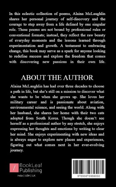 In this eclectic collection of poems, Alaina McLaughlin shares her personal journey of self-discovery and the courage to step away from a life defined by one singular role. These poems are not bound by professional rules or conventional formats; instead, they reflect the raw beauty of everyday moments and the lessons learned through experimentation and growth. A testament to embracing change, this book may serve as a spark for anyone looking to redefine success and explore the freedom that comes with discovering new passions in their own life.