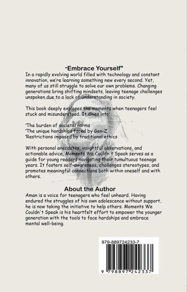 Teenage years are often described as the best time of life, yet beneath the surface lies a storm of emotions, silent battles, and unanswered questions. 'Moments We Couldn't Speak' dives into the raw, unfiltered realities of adolescence-the friendships that shape us, the love that confuses us, the pressures that weigh us down, and the quiet struggles we carry alone. Through deeply personal reflections and thought-provoking insights, this book sheds light on the experiences we hesitate to talk about-the loneliness masked by a smile, the fear of not being enough, the burden of expectations, and the journey of self-discovery amidst it all. For anyone who has ever felt unseen, unheard, or misunderstood, this book is a reminder that you are not alone. Your thoughts, your struggles, and your voice matter.